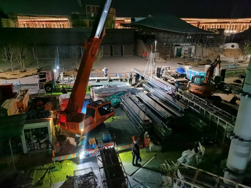 时效性是项目的另一大考验。2025年元旦假期前,中国外运团队48小时紧急操作入港,并在假期期间完成了13个40尺海运货柜的清关、提货、倒运、入园配送工作;中国春节假期期间,团队完成了近10批次的货物发运。最终,中国馆从生产到吊装封顶用时仅2个多月,中国外运助力中国馆成为了大阪世博会首个完成主体封顶的海外自建馆。